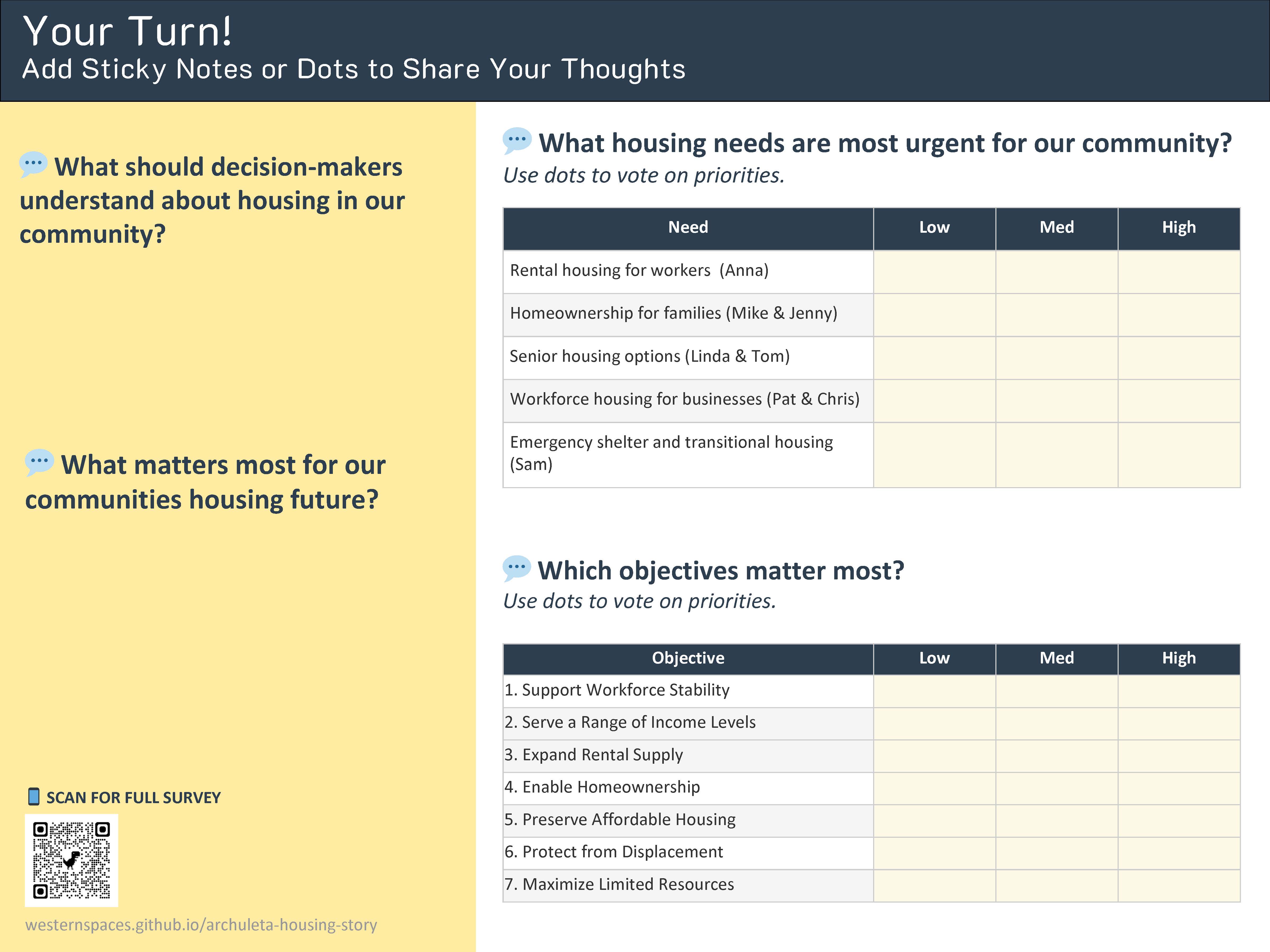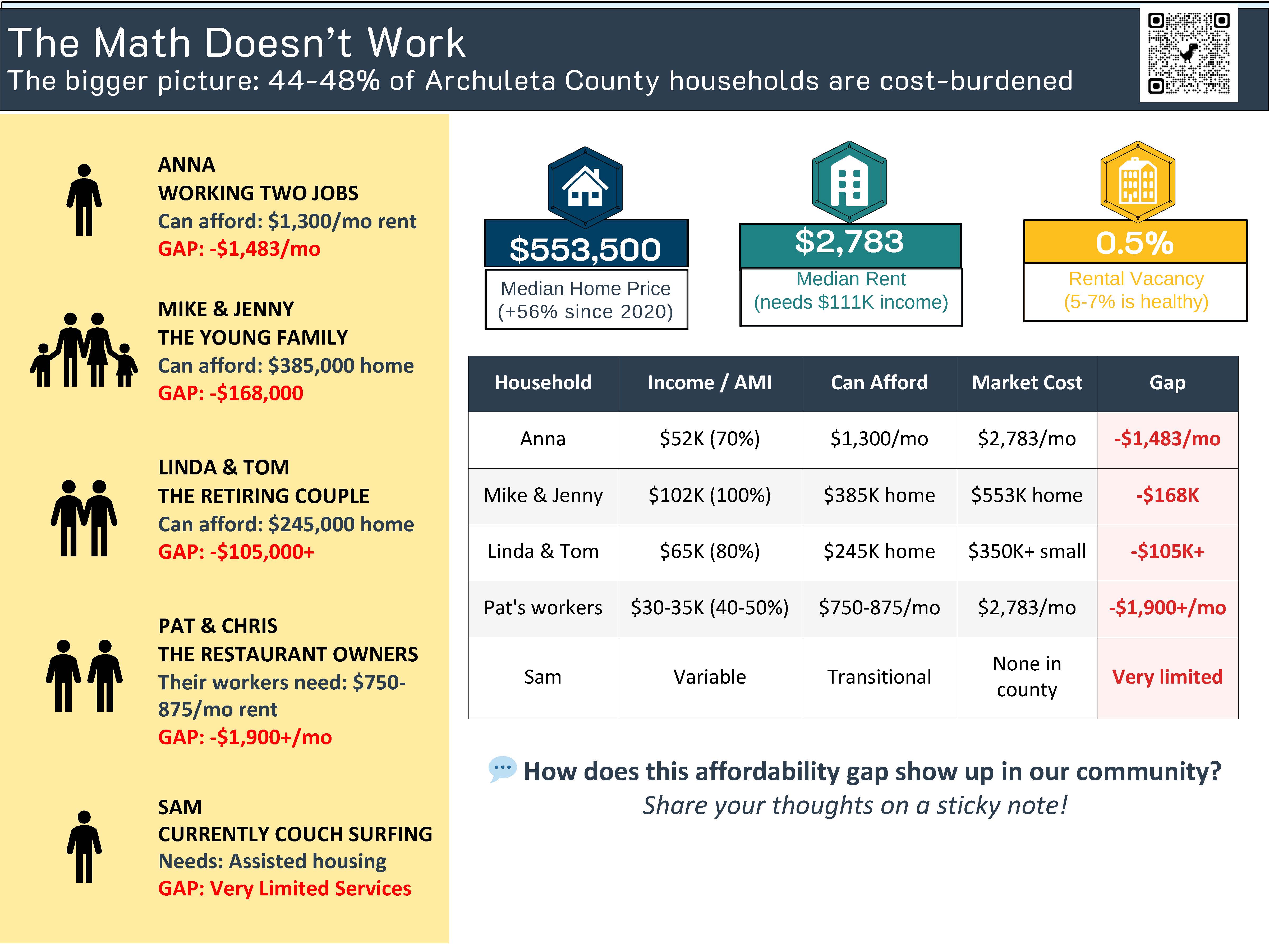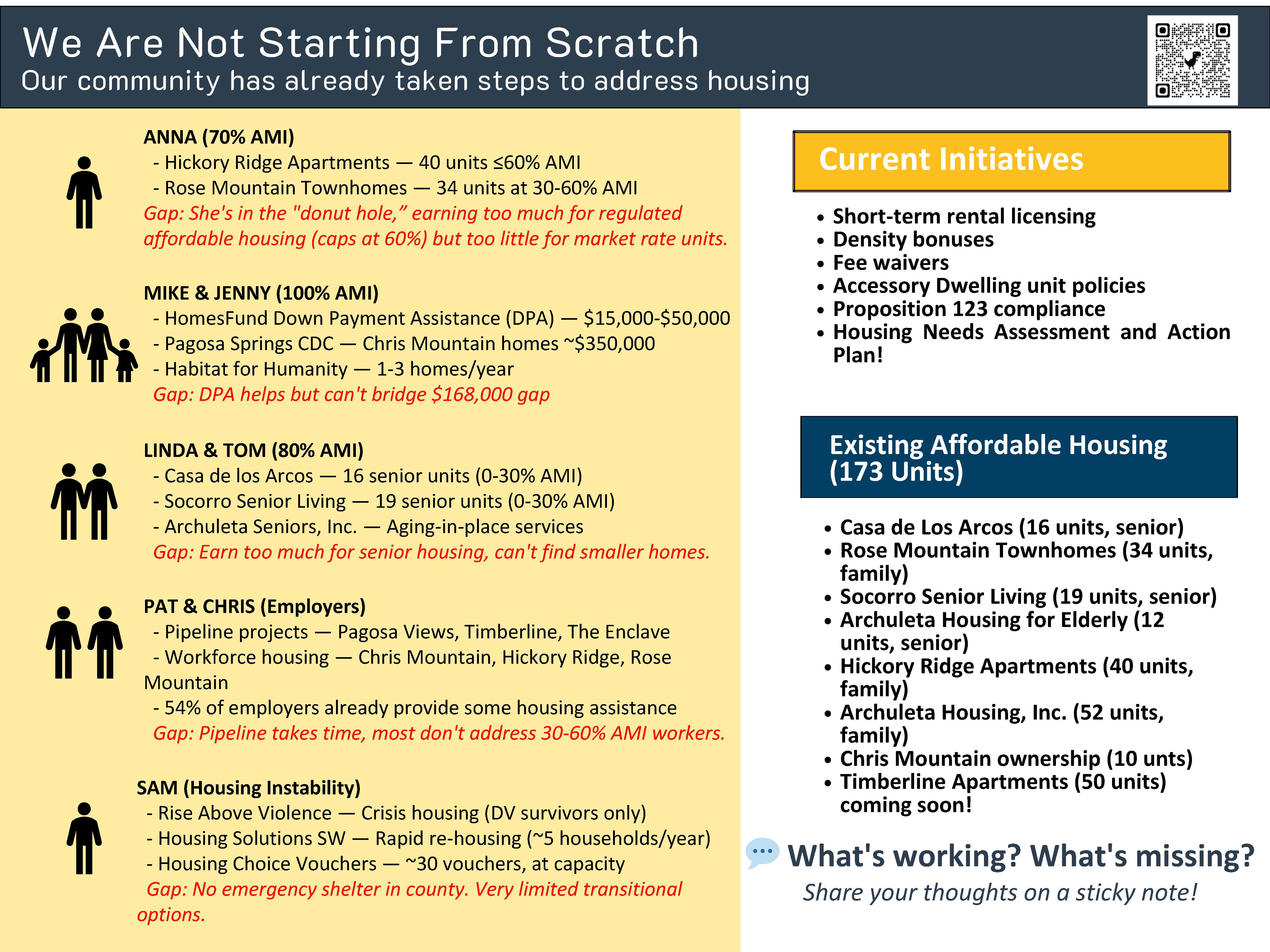 Follow five example households as they navigate Archuleta County's housing market. Learn about local housing data, see what's already being done, and share your priorities for the Housing Action Plan.